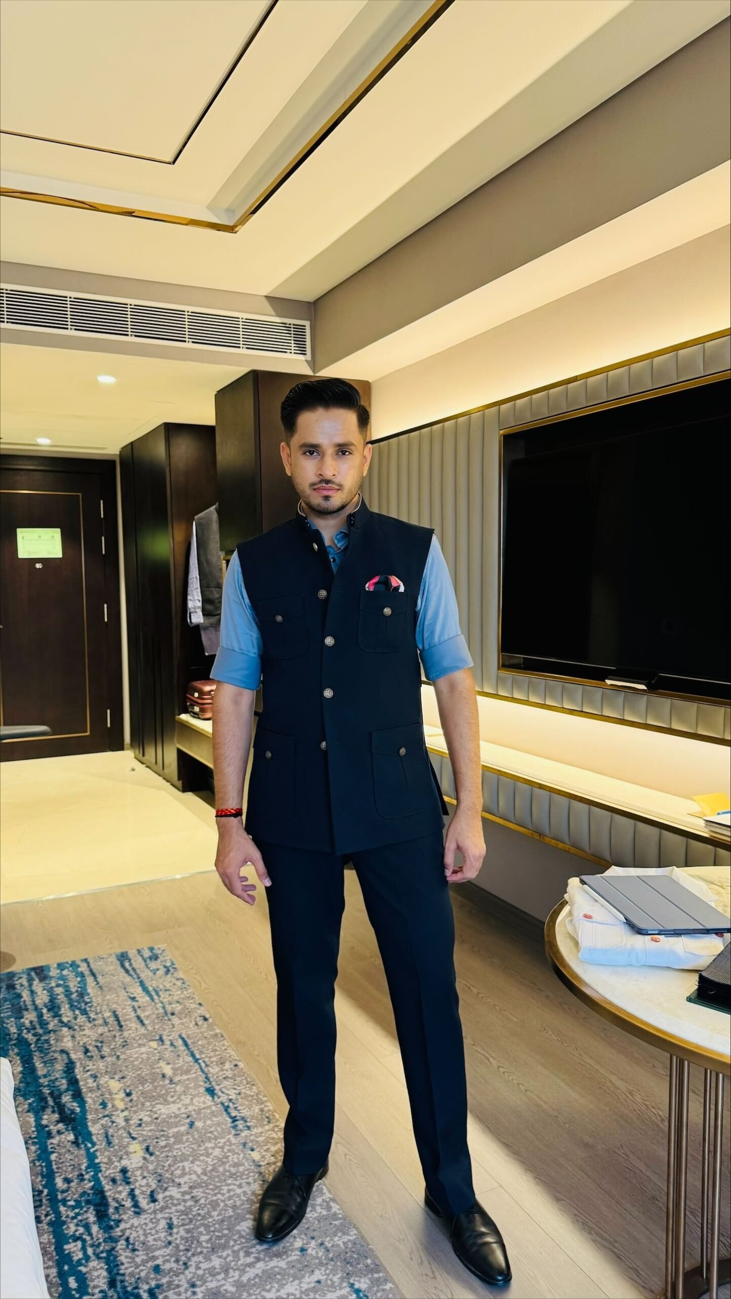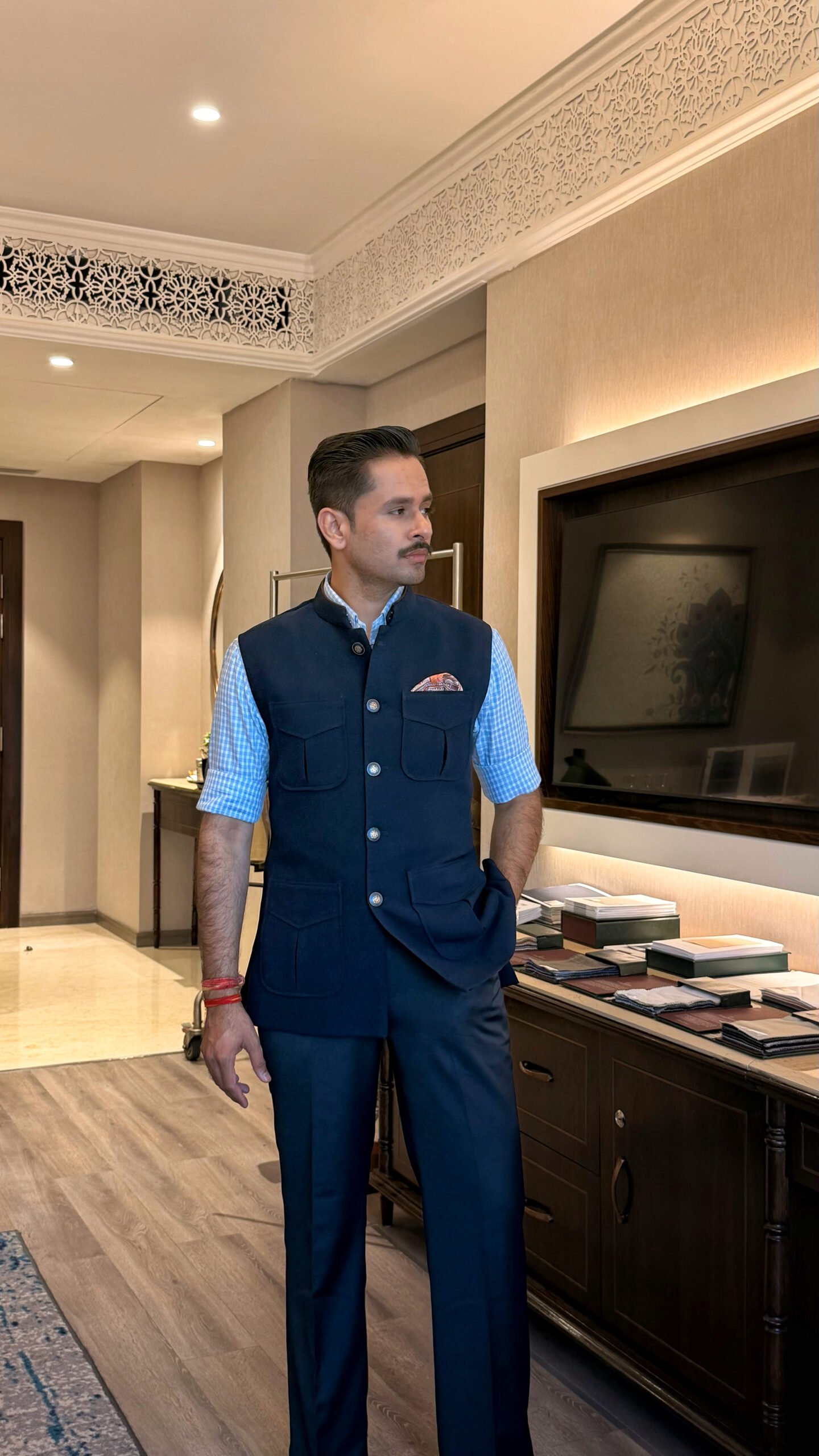 A nod to classic outdoor wear, this hunting-inspired half jacket features four functional pockets, metal buttons, and refined leather piping on the collar. Designed for versatility and structure, it layers effortlessly over kurtas or shirts—ideal for travel, festive gatherings, or smart casual styling.
