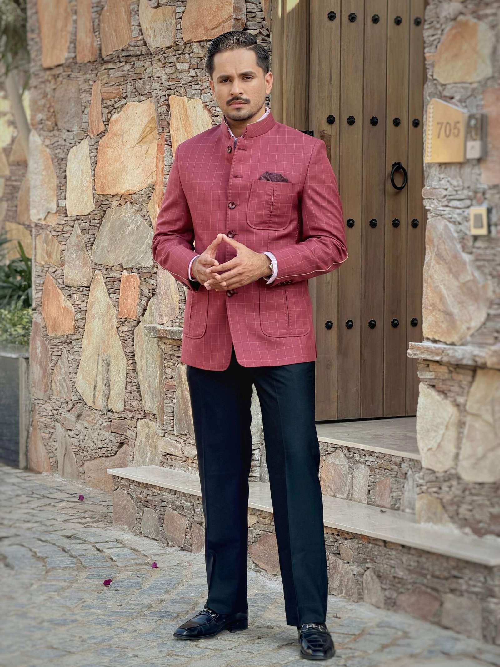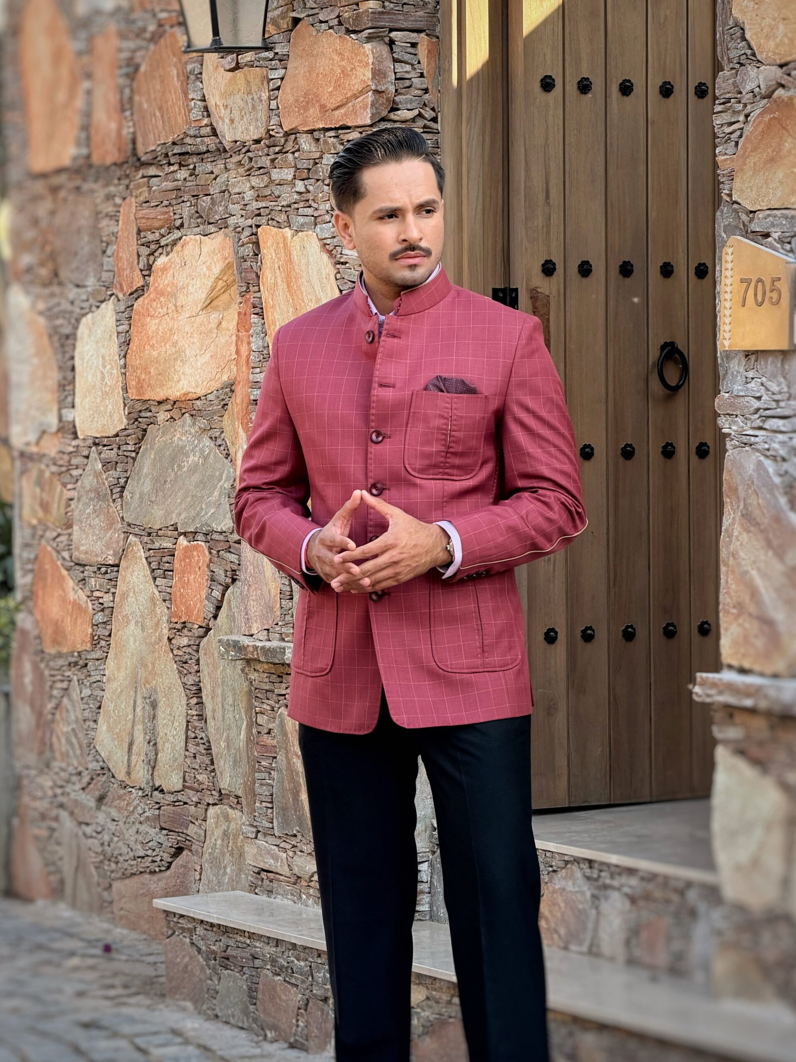 A rich burgundy checkered bandhgala coat made from finely woven wool blend Italian fabric, designed to make a strong impression without trying too hard. It features three patch pockets and subtle contrast pipings along the neck, elbows, and back — small details that add a lot of character to the overall look. The structured mandarin collar and tailored fit give it a clean, polished silhouette that works equally well for formal and festive occasions.