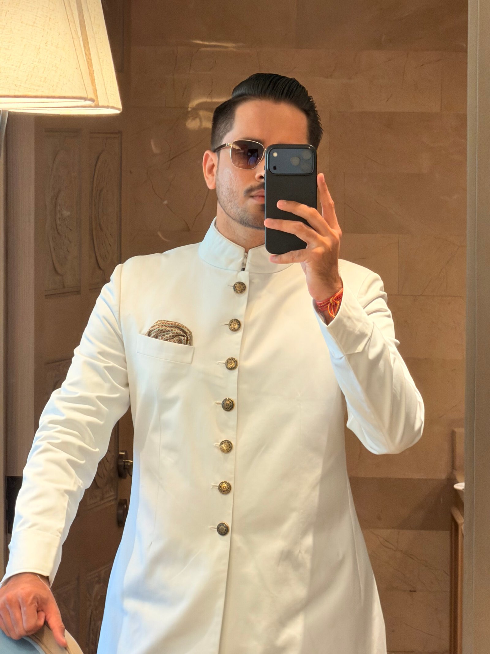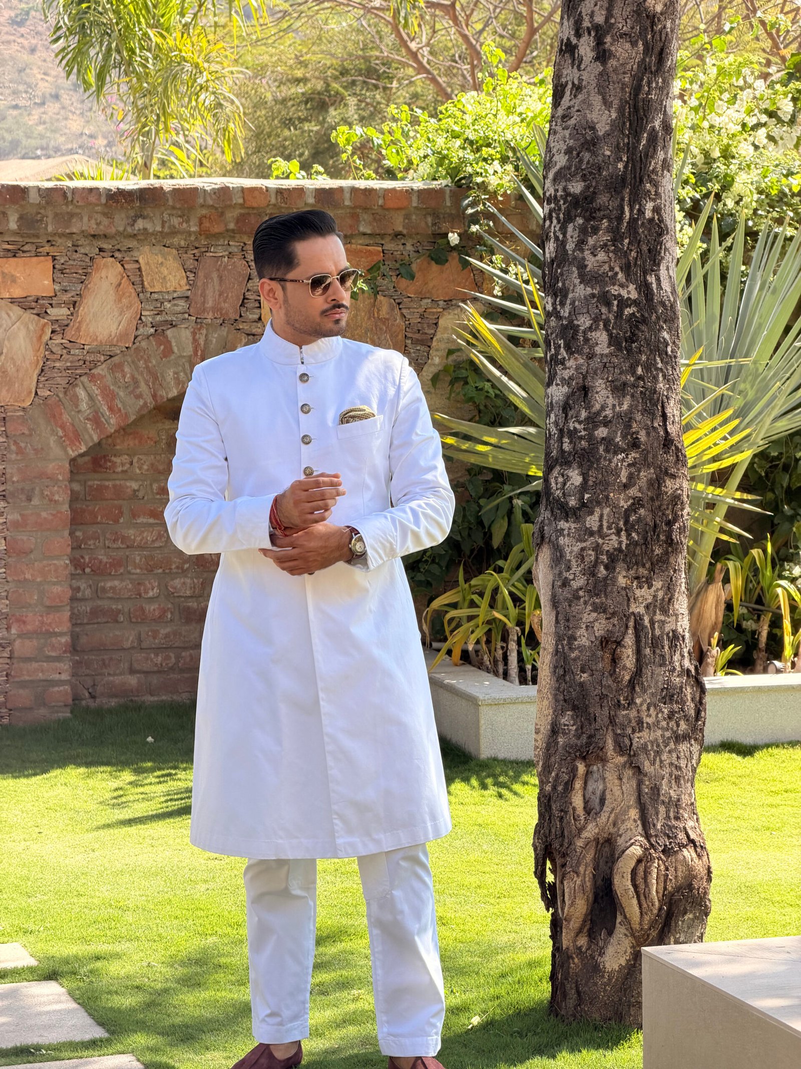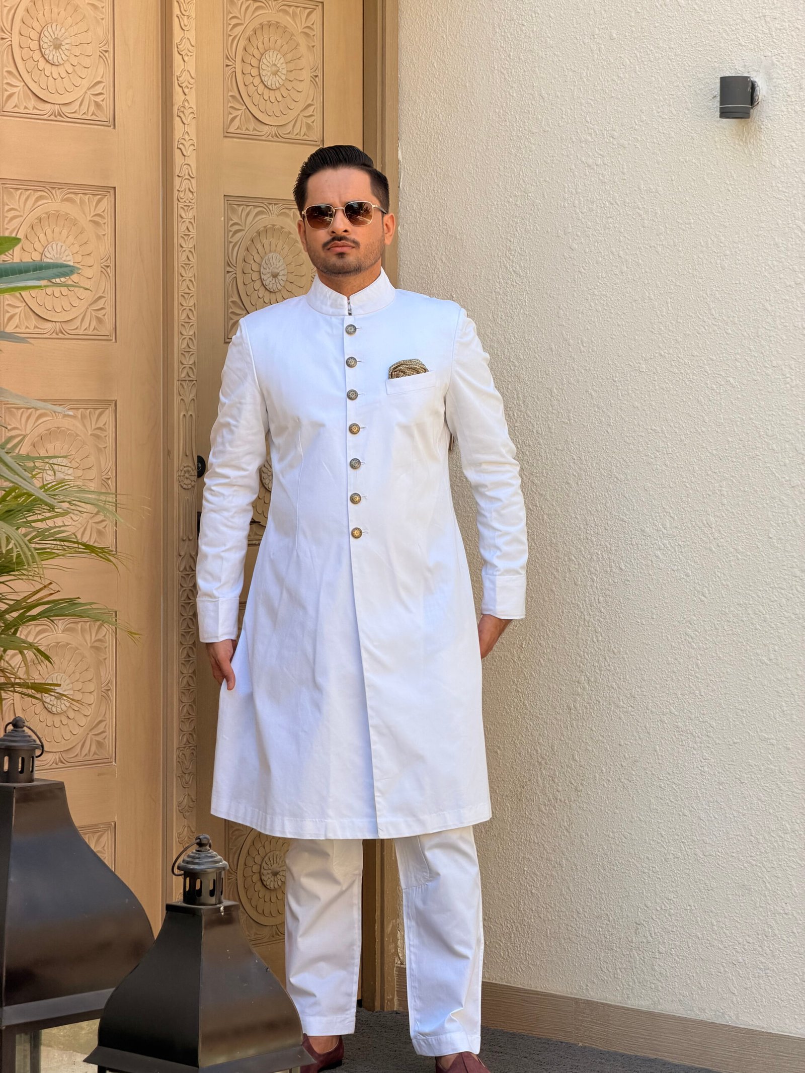 A lightweight cream achkan made from non-fused twill cotton fabric, handcrafted for those who appreciate clean cuts and quiet elegance. The relaxed, breathable build makes it ideal for summer wear without compromising on structure or finish. Minimal in detail yet rich in craftsmanship, every stitch reflects the care that goes into making it by hand.