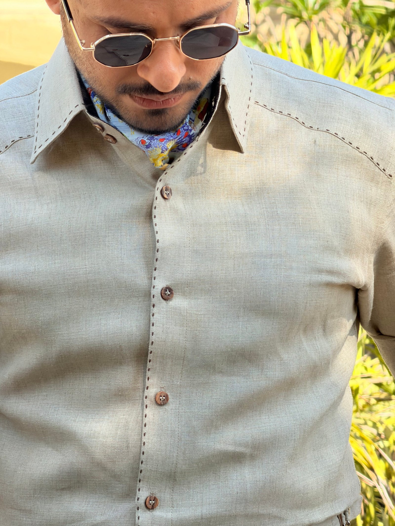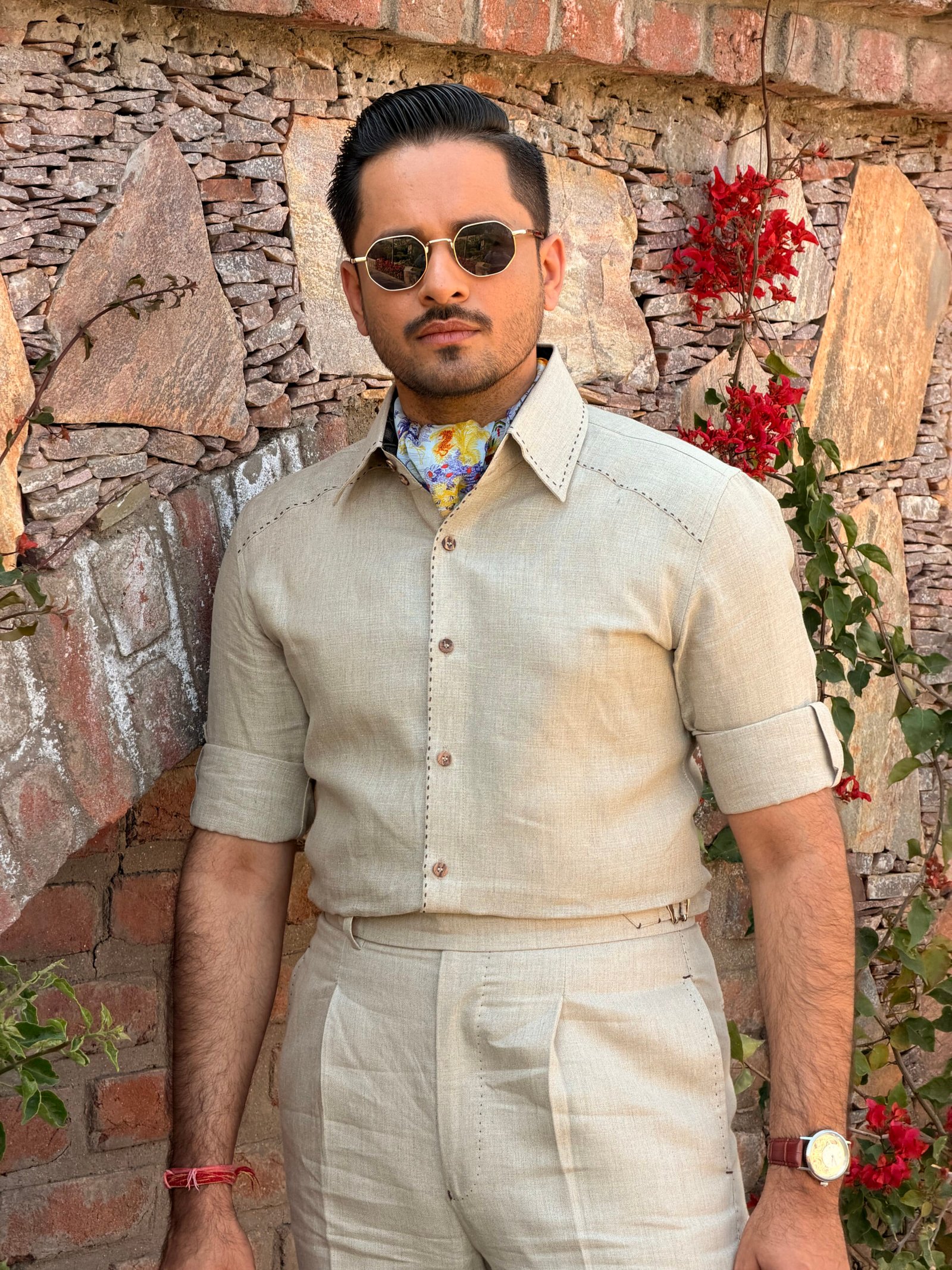 A natural beige linen co-ord set handcrafted for easy, breathable summer dressing. The half-sleeve shirt features intricate hand overstitches across the shoulders, back, and collar that add quiet detail to an otherwise clean silhouette. The matching linen trousers carry the same handcrafted attention, making the two pieces feel like a complete, considered look from top to bottom.