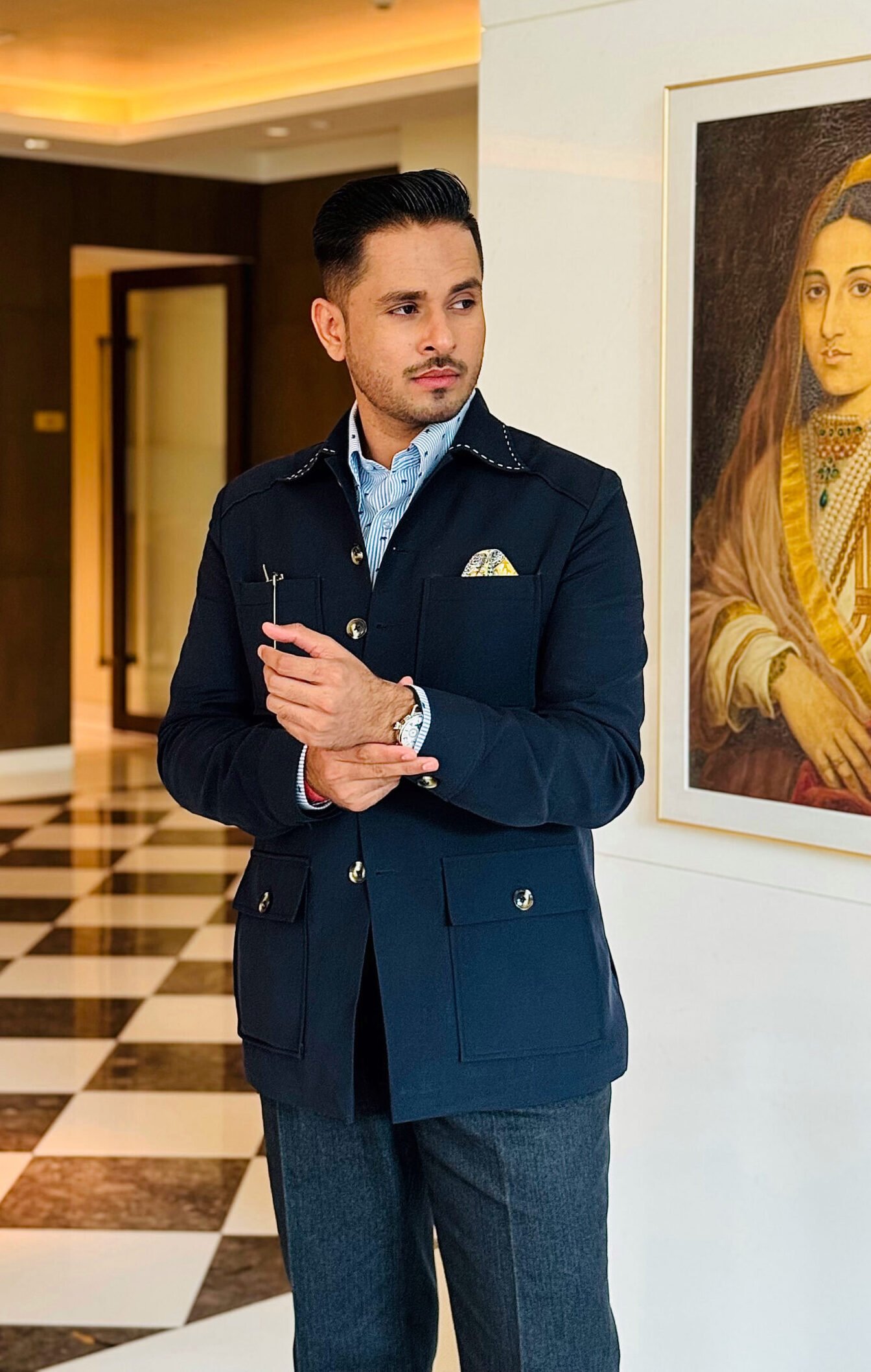 A versatile travel jacket crafted from a premium cotton blend fabric, designed for effortless comfort and movement. The piece features minimal thread overstitches over the collar, adding a subtle handcrafted detail. Non-fused and unlined, it offers a lightweight, breathable structure — perfect for refined, easy layering on the go.