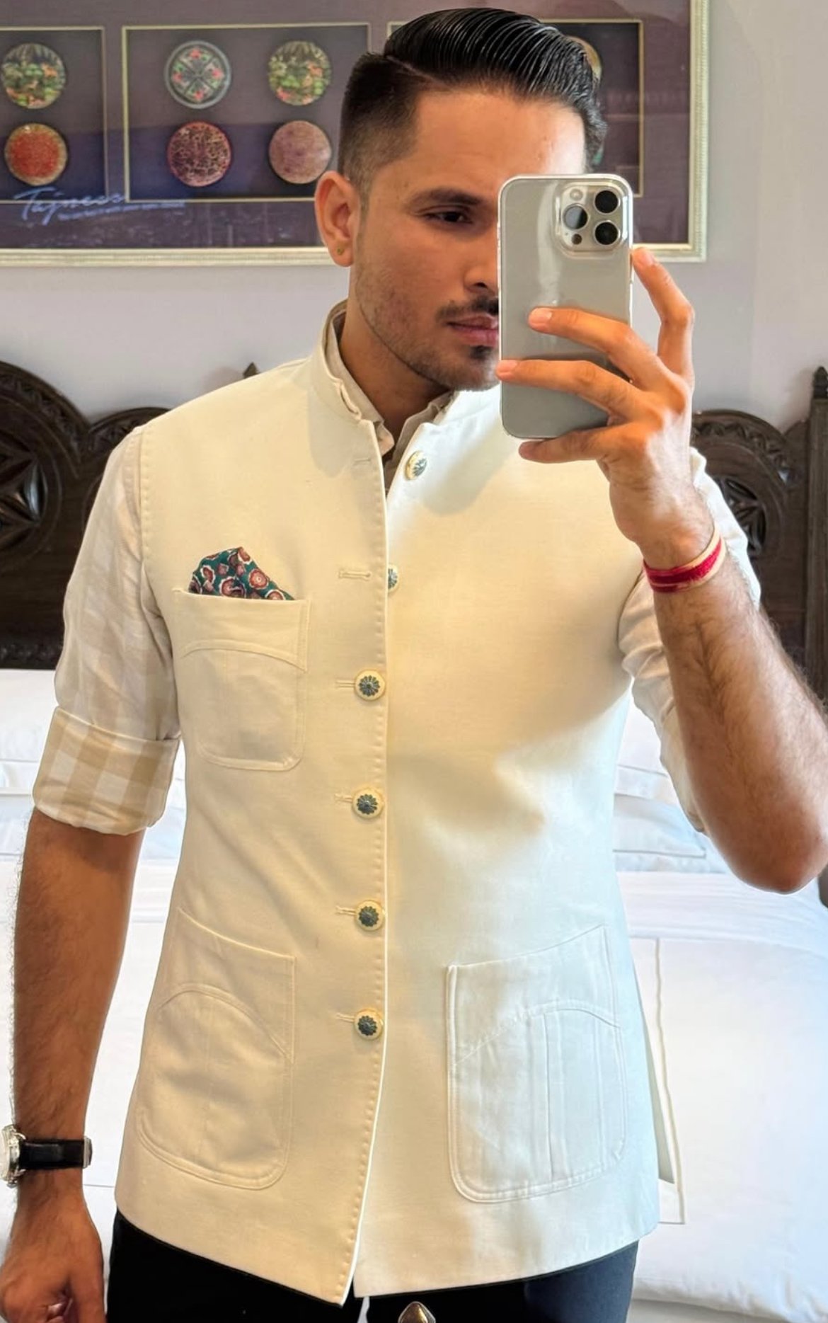 A refined off-white half jacket crafted from twill cotton, combining casual comfort with subtle elegance. Detailed with minimal hand overstitches and stylised patch pockets, this piece reflects understated craftsmanship and contemporary design. Perfect for layering, it adds a sophisticated touch to everyday ensembles.