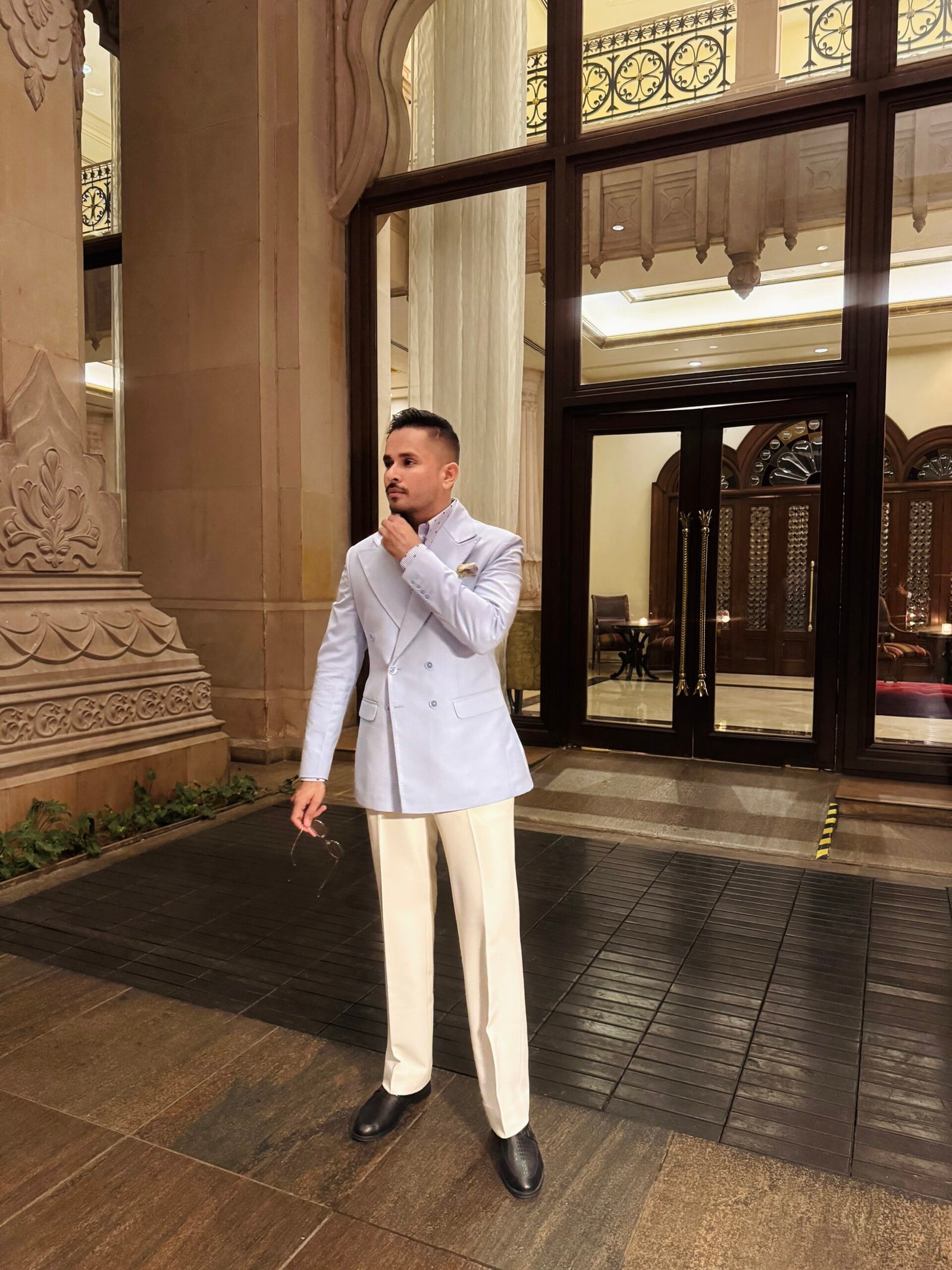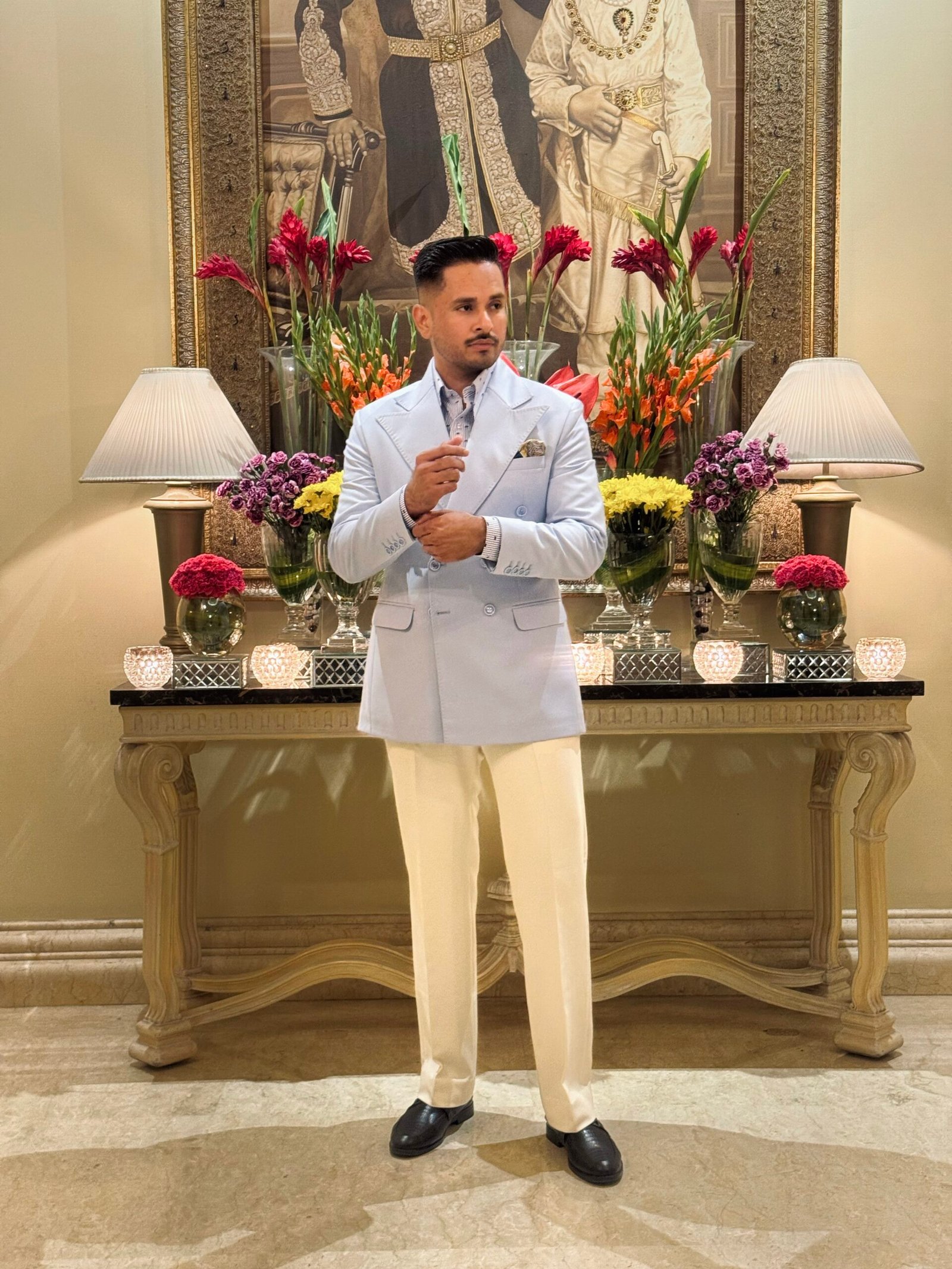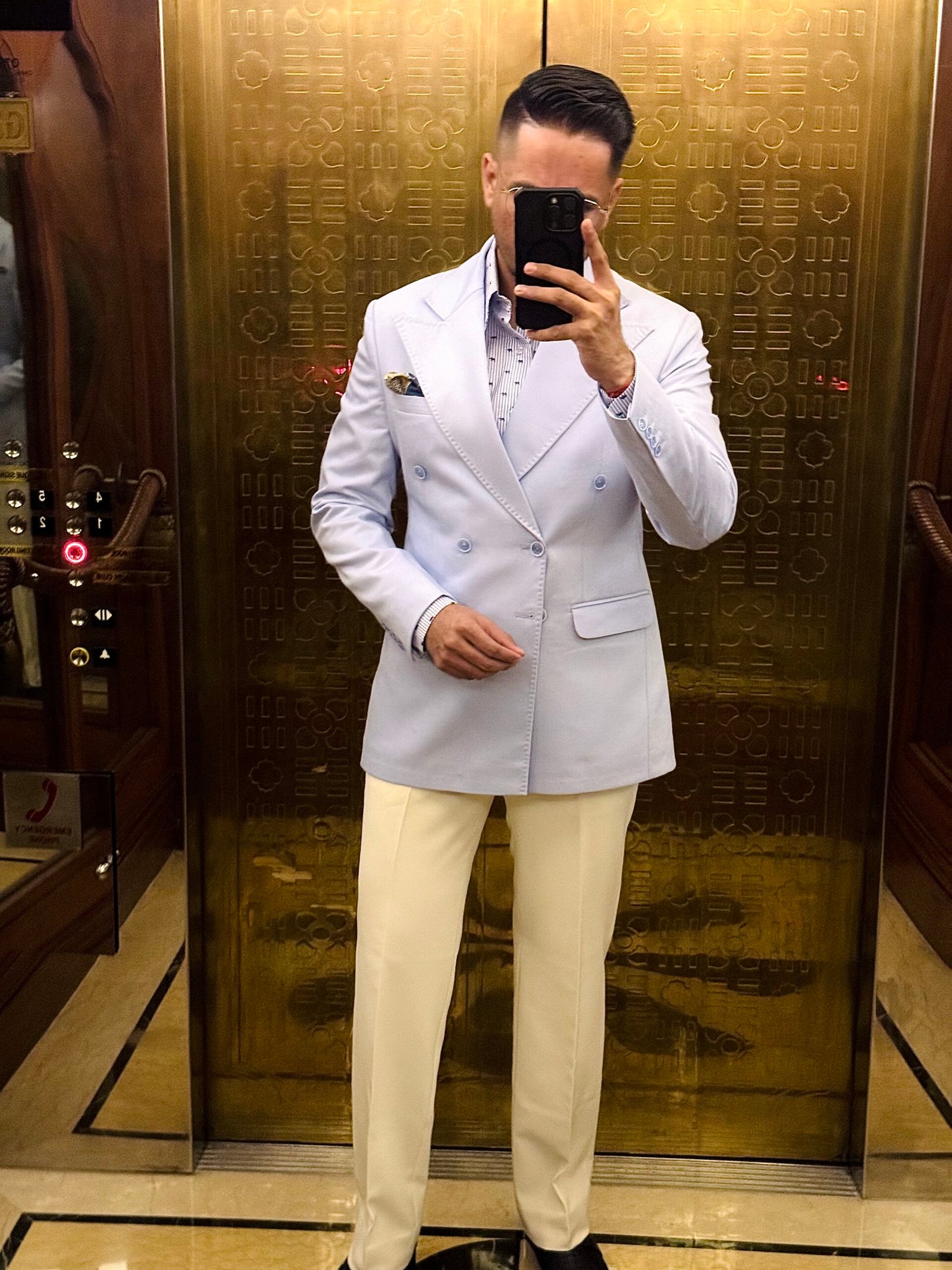 A refined double-breasted blazer and trousers set crafted from a premium wool blend fabric, designed for a polished and cohesive look. The blazer features broad lapels that enhance its structured silhouette, while the tailored trousers offer a sleek, modern fit. Perfect for formal occasions or distinguished everyday wear, this ensemble combines classic elegance with contemporary sophistication.