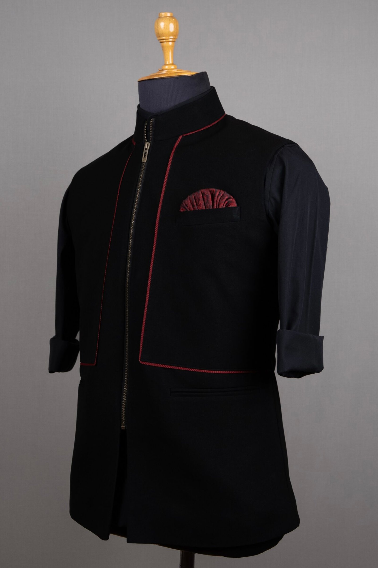 Elevate your wardrobe with this sleek half jacket, crafted from premium viscose fabric for a luxurious feel and effortless drape. The jacket features bold red overstitched detailing that adds a touch of contrast and style, while the classic zipper provides a modern, functional finish. Perfect for layering, this versatile jacket comes in a range of color variants, allowing you to choose the perfect hue to match your personal style. Whether you’re dressing up for an evening out or going for a casual yet polished look, this jacket is designed to make a statement.